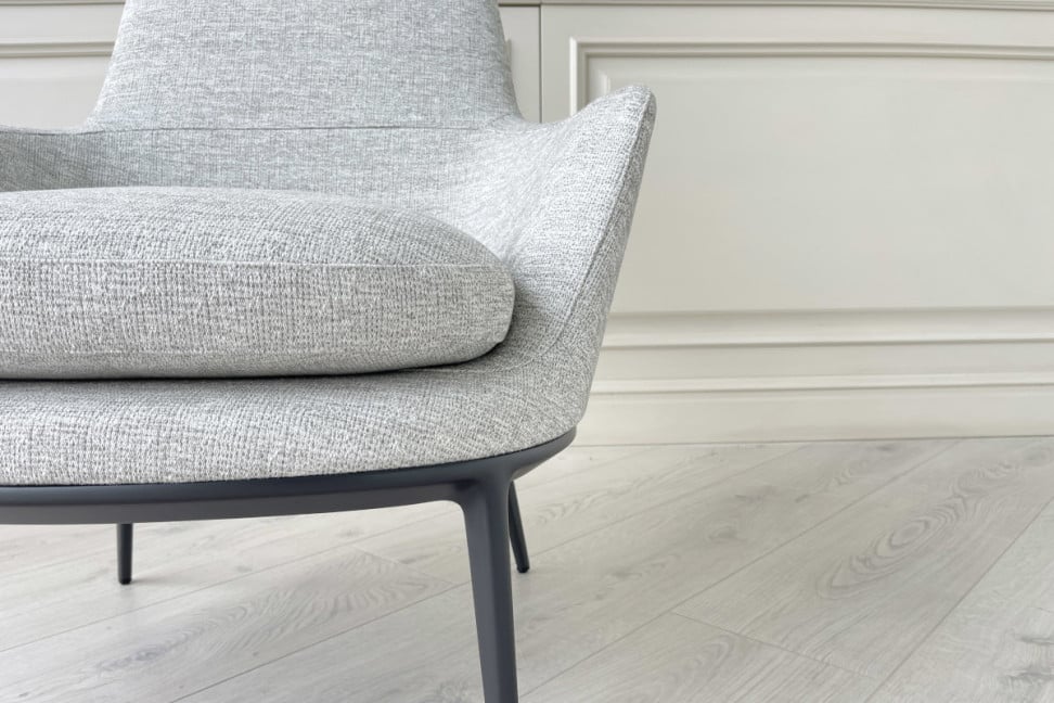 La poltrona Caratos con schienale alto in offerta Expo nel nostro showroom presenta una struttura in alluminio verniciato grafite, con seduta rivestita in tessuto grigio melange