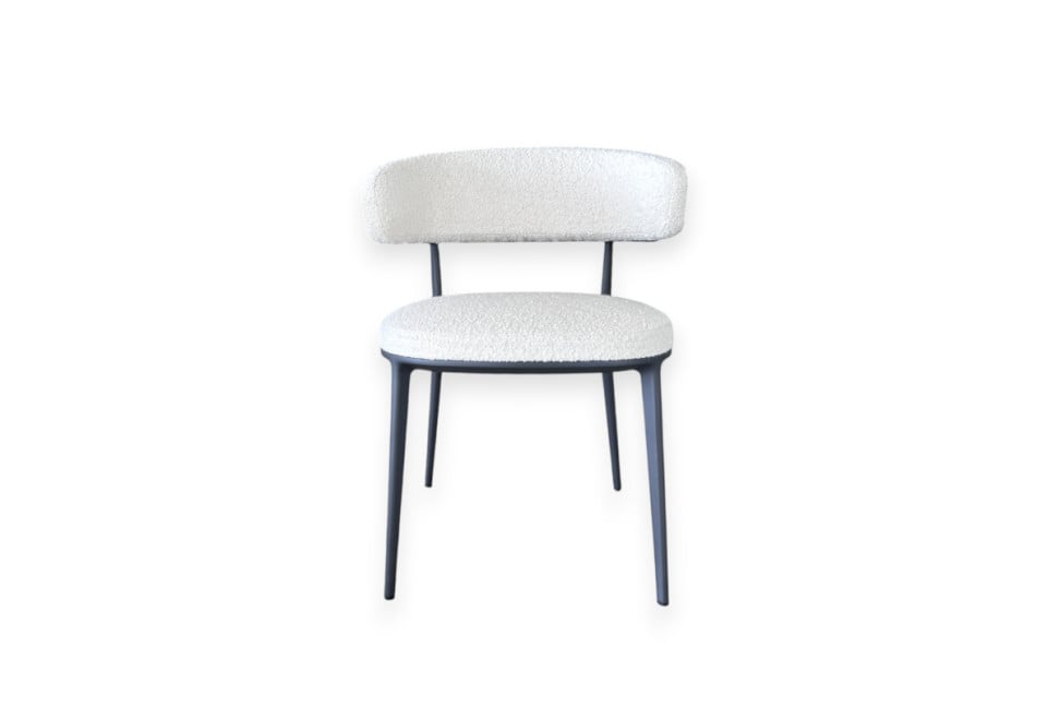 La sedia alta Caratos in offerta expo nel nostro showroom ha una struttura in fusione d’alluminio verniciato color grafite, mentre seduta e schienale sono rivestiti con un raffinato tessuto in bouclè di colore bianco che, in contrasto con la struttura, ne esalta le forme e la raffinatezza.