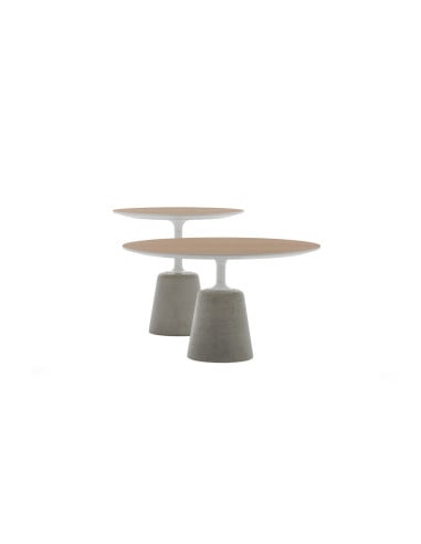 Se si preferisce un look più audace e strutturato, è possibile optare per un piano in cemento, nei colori bianco o antracite. Questo materiale conferisce al tavolino una robustezza notevole e una resa estetica particolare. Un'alternativa interessante è rappresentata dal piano in cemento di chip di pietra. Questo tipo di piano è realizzato in UHPFRC e colorato con ossidi naturali. La superficie presenta una composizione di rocce e sassi alpini (stone chip top) o di pietre toscane (top in terracotta). Infine, per gli amanti del calore e della naturalezza del legno, è disponibile un piano in fibra di legno impiallacciato in rovere sbiancato, tinto bruno o noce Canaletto.
