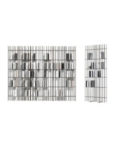 Caratteristiche Tecniche: Struttura in metallo verniciato con ripiani in vetro. Disponibile nelle versioni da terra, nelle varianti Wall, nel modello Wine o Tower e con kit extension dedicato. La struttura è composta da bacchette metalliche disposte a intervalli differenti, secondo una partizione irregolare. Sistema modulare progettato per configurazioni affiancate o sovrapposte.