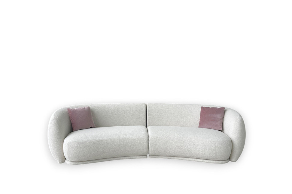 Il divano Pacific in offerta Expo nel nostro showroom è rivestito da un morbido tessuto di colore bianco. I piedi sono in polipropilene nero ed include due cuscini decorativi in piuma d'oca dal delicato colore rosa antico.