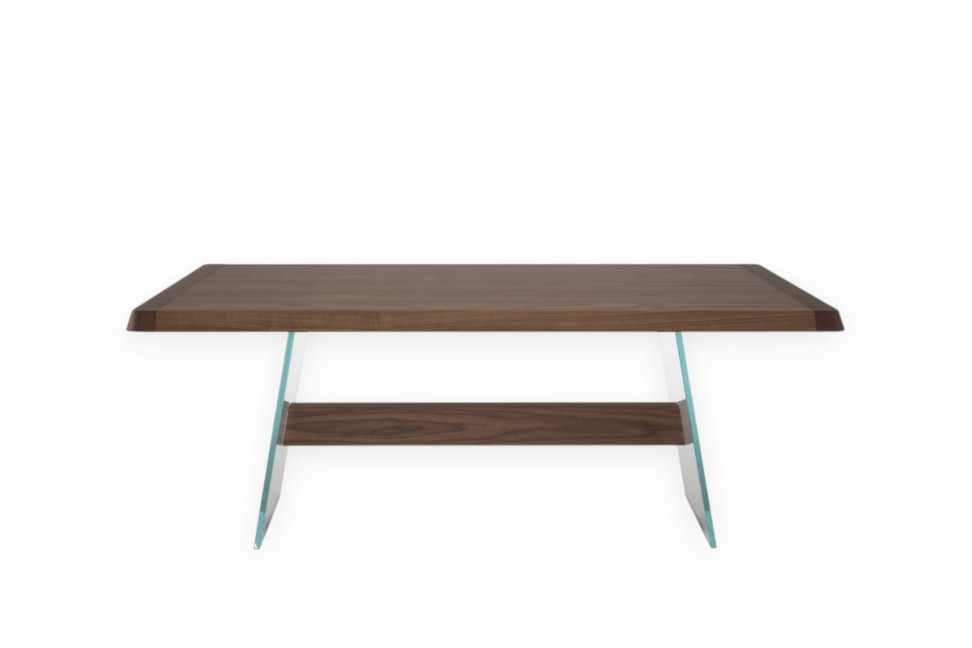 Caratteristiche Tecniche: Il tavolo da pranzo Phantom presenta una base realizzata in vetro temperato extra-chiaro, composta da due lastre di forte spessore collegate da una traversa centrale in legno massello, disponibile in diverse finiture. Il sistema di fissaggio prevede piastre in acciaio inox e incollaggio UV per garantire stabilità e sicurezza, mentre inserti antiscivolo in gomma assicurano un corretto appoggio delle lastre in vetro.