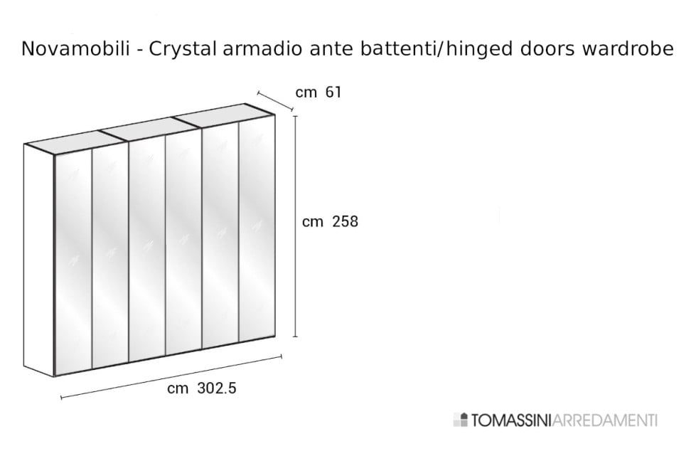 Caratteristiche Tecniche: L'armadio Crystal ad ante battenti, come tutti gli armadi con porta a battente, può essere realizzato con pannello laterale in vetro e organizzato internamente con il separatore a telaio, eventualmente equipaggiato con illuminazione a LED. Da considerare che la massima altezza per l'anta specchiata non può superare i cm.258.