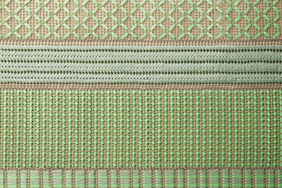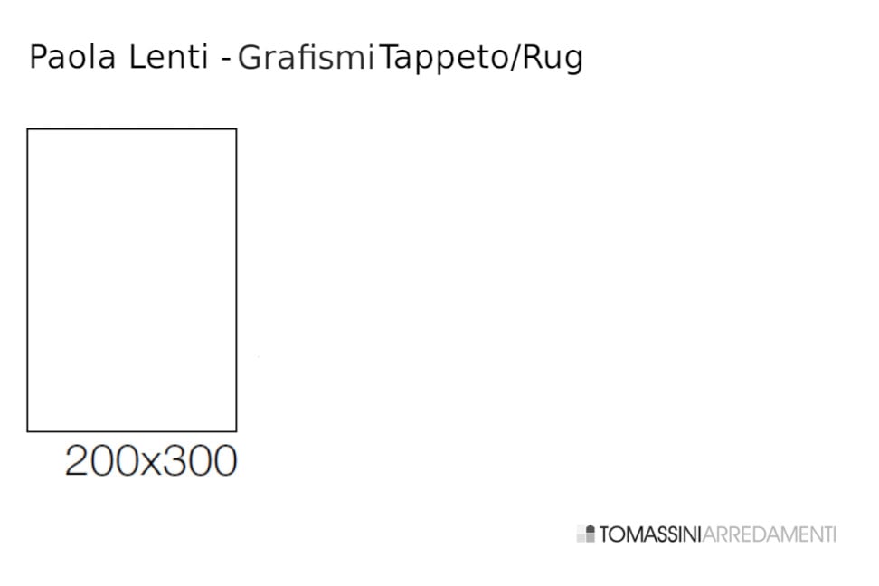 Il tappeto Grafismi di Marella Ferrara è l'originale opera modulare inserita nelle collezioni di tappeti Paola Lenti. Ogni pezzo è decorato a mano con ricami geometrici, realizzati con trecce piatte in tinta unita o bicolore, utilizzando il resistente filato Rope. Il tappeto è costituito dall'unione attraverso una cucitura con punto Zigzag, di strisce in tessuto Kimia di diverse larghezze. Gli spazi lasciati tra i ricami e la trama del tessuto lasciano intravedere il pavimento, donando un effetto elegante e leggero. Il tappeto Grafismi può essere personalizzato scegliendo un colore per il backing e da due a tre colori per il ricamo, selezionati dal campionario Corda 10. La disposizione dei decori e dei colori viene definita con cura dall’azienda per garantire un effetto cromatico armonioso.