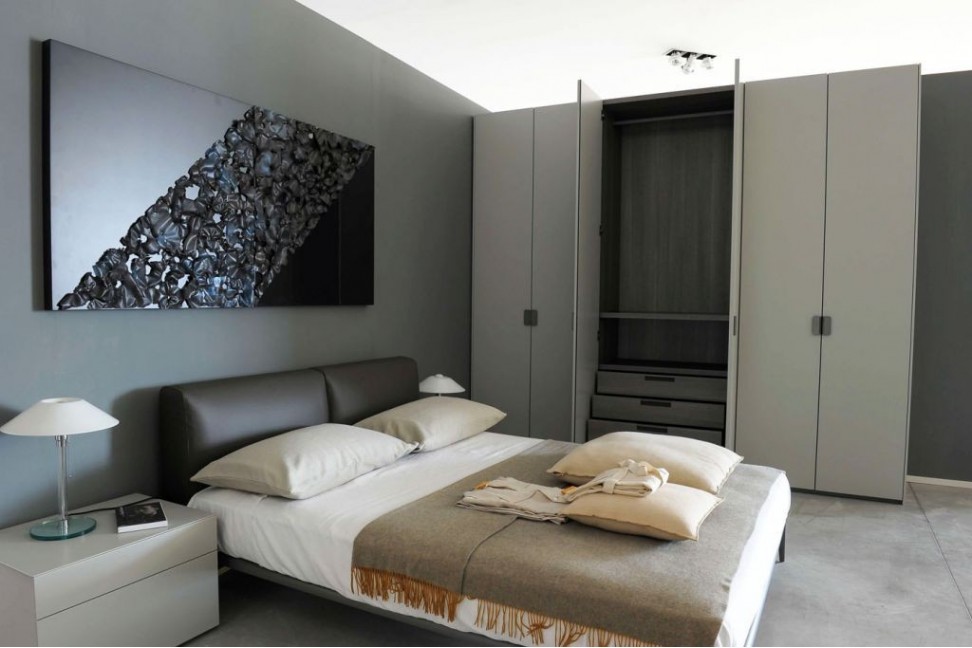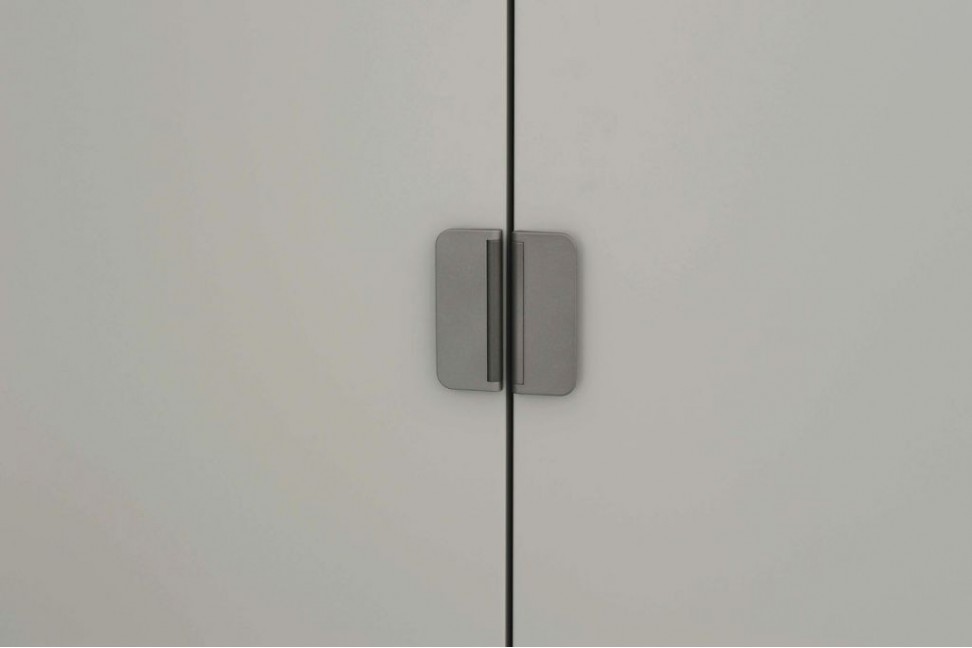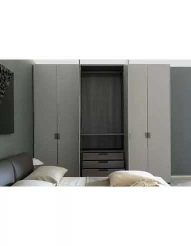 L'armadio New Entry in Offerta Expo è caratterizzato da 6 ante battenti con finitura laccato opaco, color Quarzo. Ogni anta è arricchita con una pratica maniglia, modello Volo, verniciata color piombo. L'interno è in rovere cenere ed ed attrezzato con una cassettiera, tre comodi ripiani rivestiti in tecno-pelle Visone e cinque tubi appendiabiti.