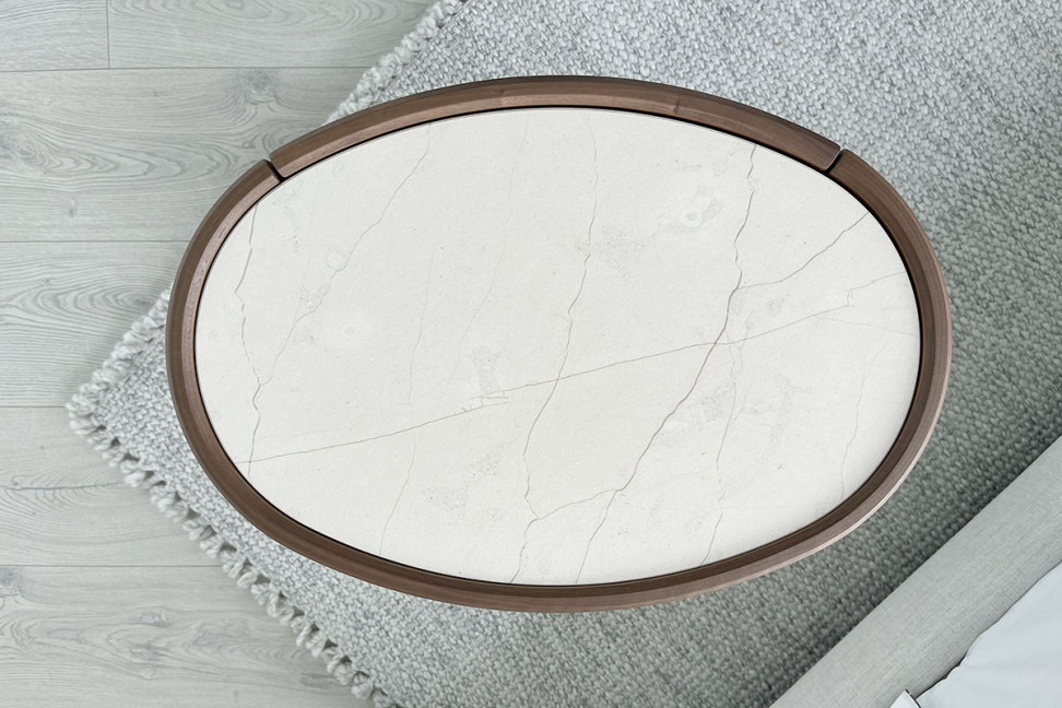 Struttura in noce canaletto, top in marmo Zecevo opaco e piedi in metallo verniciato champagne opaco