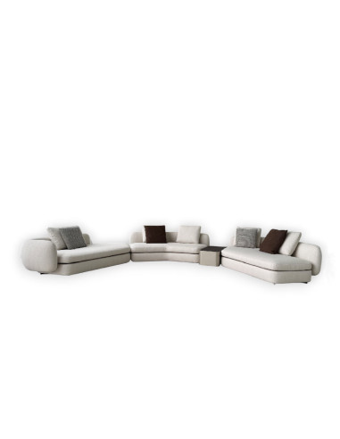 Il divano Saint Germain in offerta Expo nel nostro showroom presenta un rivestimento in tessuto color sabbia ed è composta da due elementi terminali ed uno centrale con l'inserimento di un tavolino tra i diversi moduli. Completano e movimentano la composizione i cuscini schienali e a saponetta con colorazioni a contrasto.
