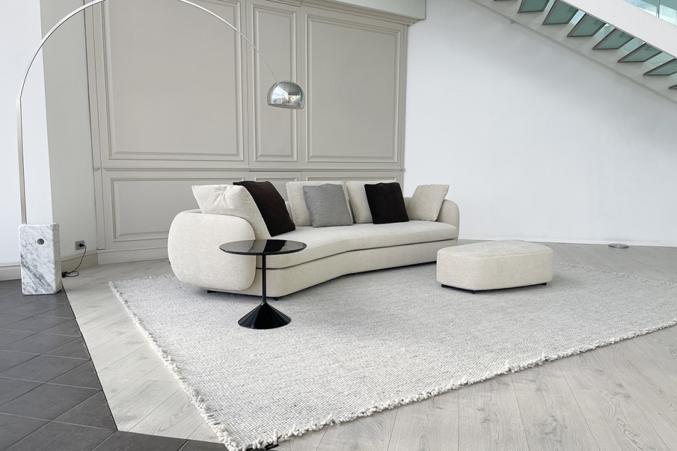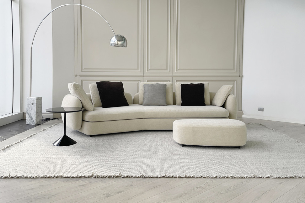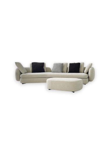 Il divano Saint-Germain Boomerang in offerta expo nel nostro showroom presenta un rivestimento in tessuto sabbia.
