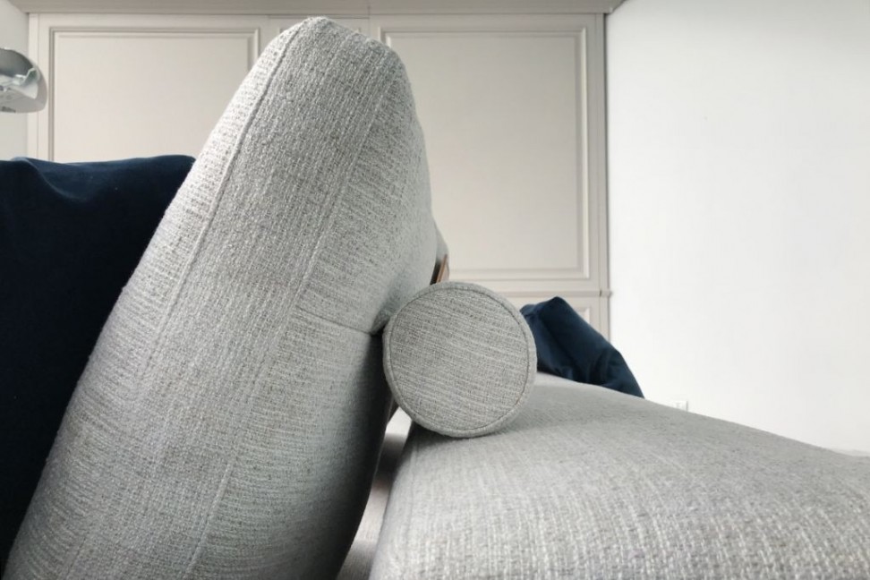 Elementi di seduta e cuscini di supporto rivestiti in tessuto color grigio tortora chiaro; cuscini decorativi rivestiti in velluto blu.