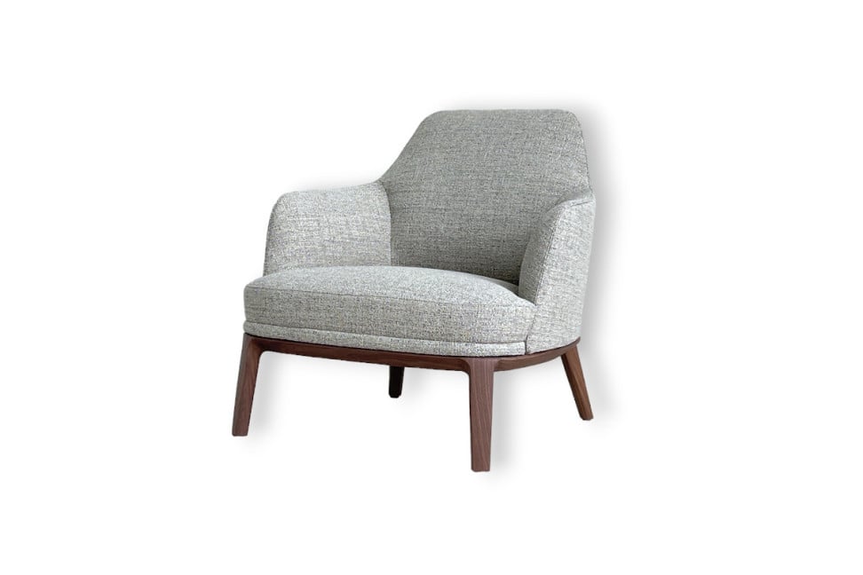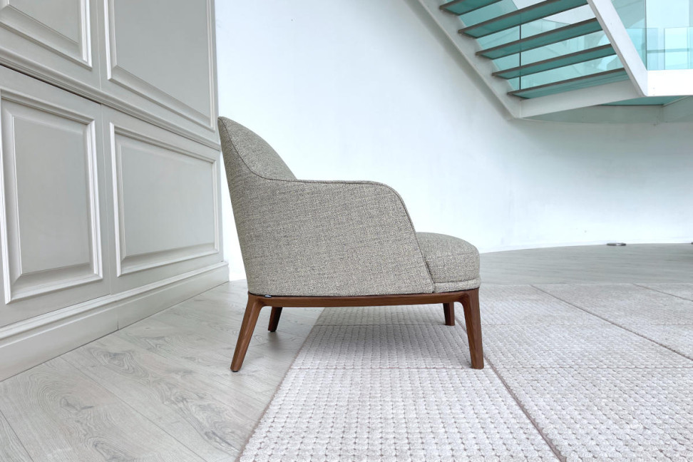 La poltrona Jane Large in offerta expo nel nostro showroom è caratterizzata da un rivestimento in tessuto color tortora, con una struttura in noce canaletto.