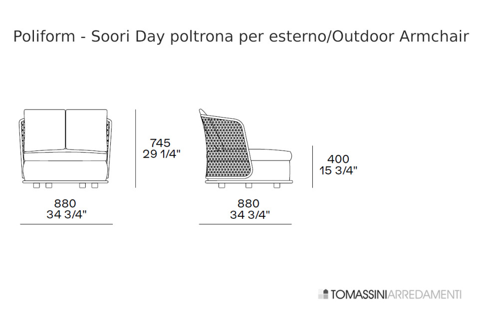 La poltrona outdoor Soori Day viene prodotta nell'unica dimensione: cm. 88x88x74,5h.