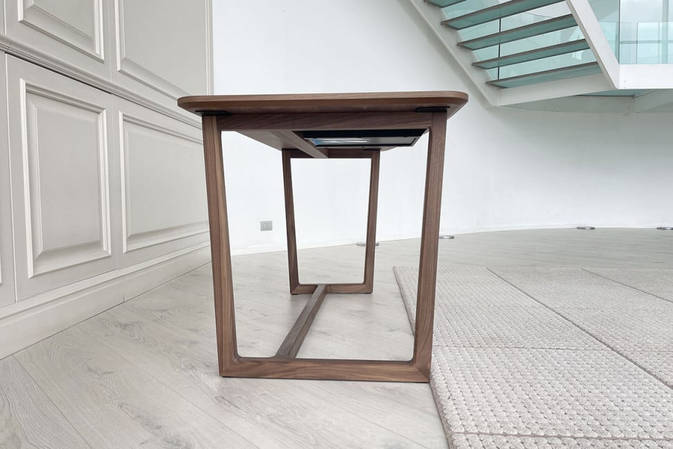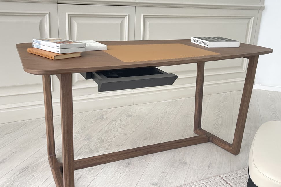 Lo scrittoio Concorde in Offerta Expo nel nostro showroom presenta una struttura in noce canaletto. L'offerta include un pratico cassetto sottopiano nella stessa finitura e un elegante piano sottomano in cuoio.