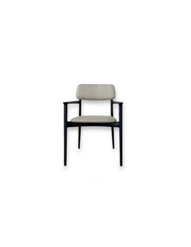 La Sedia Curve in offerta expo nel nostro showroom è la versione con braccioli. La struttura è in olmo nero, la seduta e lo schienale sono rivestiti di tessuto in color corda.