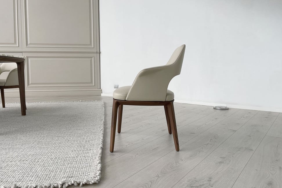 La sedia Sophie Lite in offerta Expo nel nostro showroom è rivestita in pelle beige, con gambe in legno di noce.
