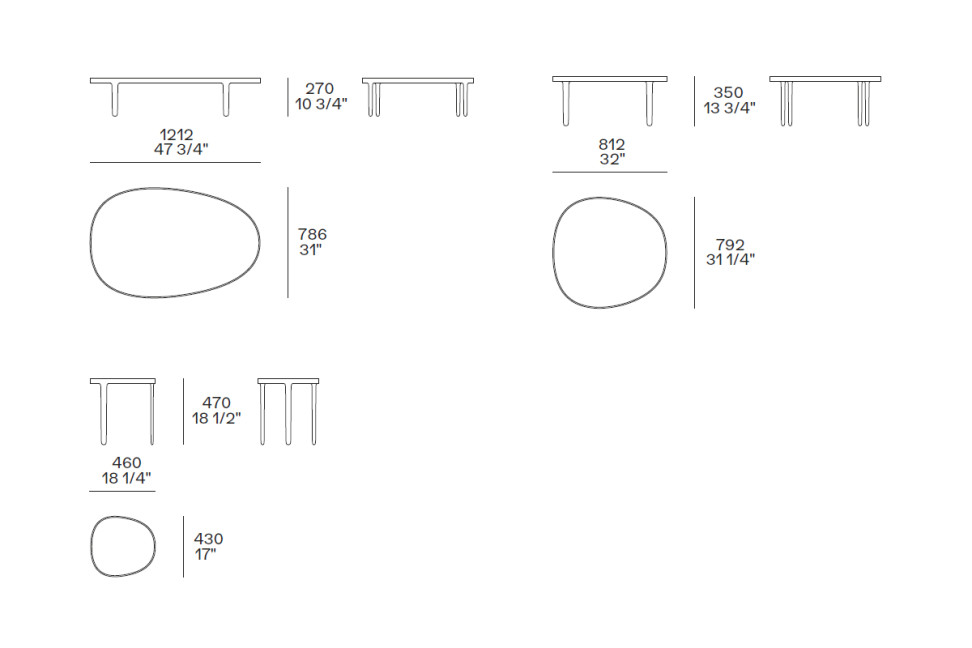 I tavolini outdoor Mad Out, ideali per accompagnare divano e poltrona, vengono prodotti in tre diverse dimensioni e altezze: cm.121,2x78,6x27h, cm.81,2x79,2x35h e cm.46x43x47h.