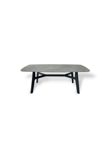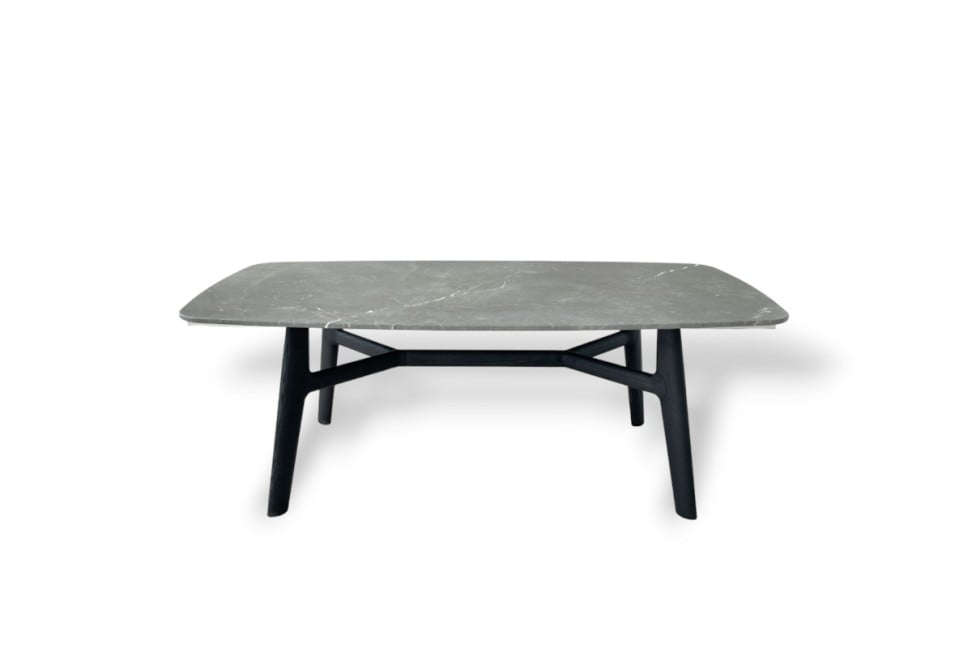 Il Tavolo Curve in offerta expo nel nostro showroom è nella versione in legno massello, con traverso centrale e gambe in finitura color olmo nero, e piano in marmo color grigio stardust in finitura opaca.