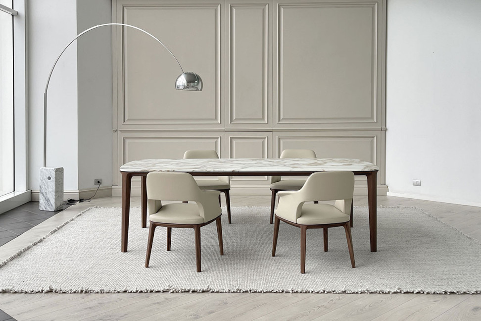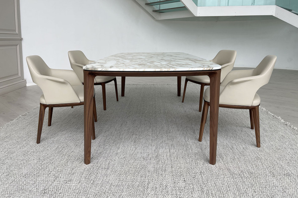 Il tavolo Henry in offerta Expo nel nostro showroom presenta gambe in noce e un piano in marmo Calacatta opaco.