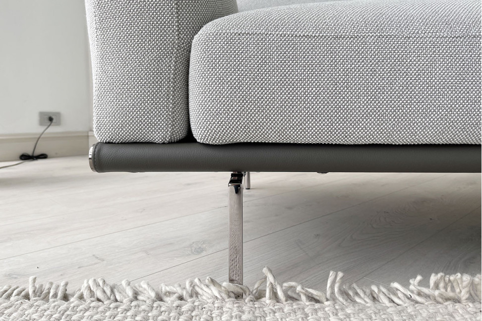 Rivestimento in tessuto color grigio chiaro. Fascia ornamentale in pelle color grigio tortora scuro e i piedini sono in allumino finitura ruthenium.