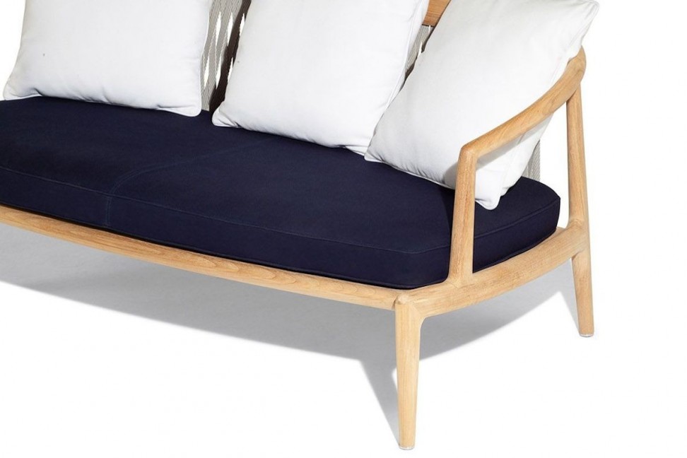Il divano è caratterizzato da una struttura in legno di teak naturale, impreziosito da uno schienale creato da un particolare intreccio di fettucce in cotone bicolore, ecrù e taupe. Le cuscinature sono libere e dal design leggero e grazie ad un'imbottitura pensata per far drenare l'acqua consentono una rapida asciugatura. Il divano The Secret Garden, insieme alla poltrona e ai tavolini della medesima collezione, si presta ad arredare terrazze, patii, verande e deck di yacht.