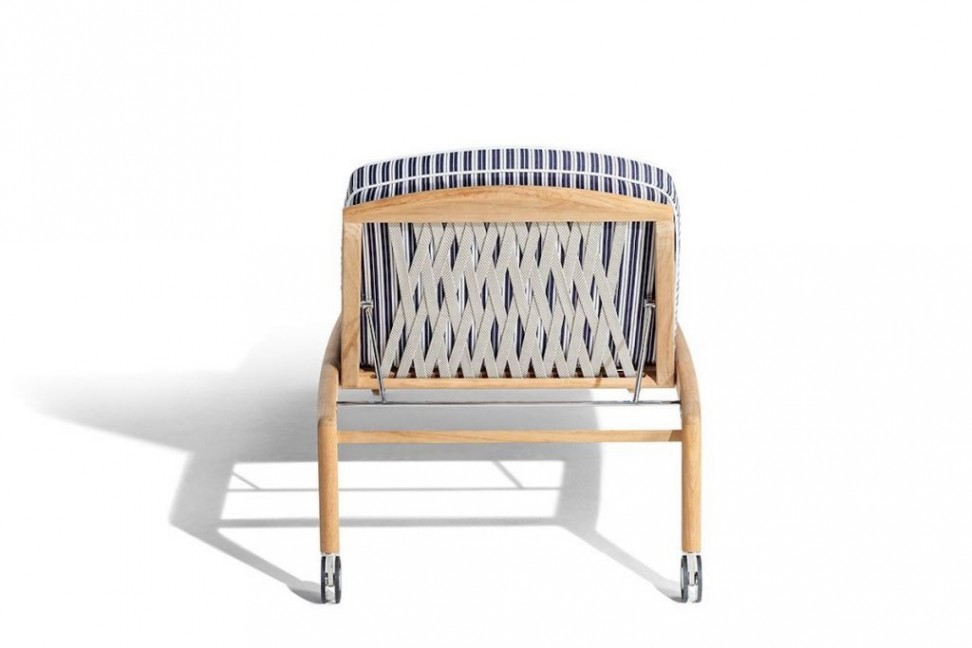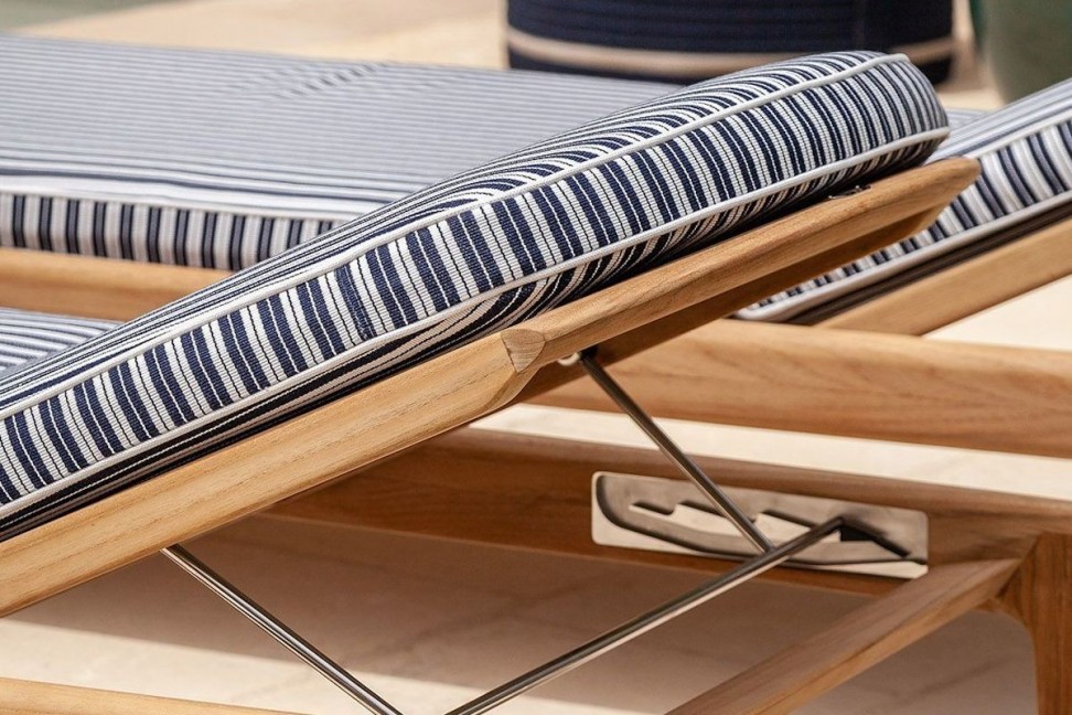 La struttura è in legno di teak ed è caratterizzata da un design leggero e informale; lo schienale è reclinabile in tre posizioni ed è costituito da un intreccio di fettucce piatte di colore ecrù e taupe; la cuscinatura permette il drenaggio dell'acqua e garantisce una rapida asciugatura. Il lettino per esterno The Secret Garden è proposto con rivestimento nella selezione di tessuti outdoor di Poltrona Frau.