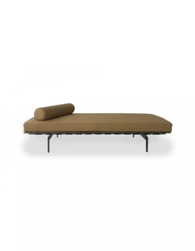 La panca Clayton in offerta Expo presso il nostro showroom presenta un rivestimento in pelle color tabacco, ed è impreziosita dalla presenza di un cuscinetto cilindrico in tinta.
