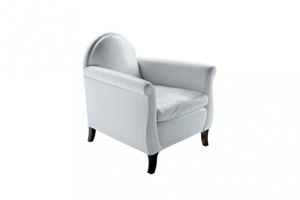 La poltrona Lyra è caratterizzata dallo stile formale del salotto vittoriano, con schienale arrotondato e rifinito da una fila di chiodini rivestiti in pelle.