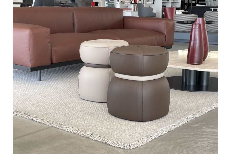 Il duo di pouf Leplì in Offerta Expo nel nostro showroom è caratterizzato dal contrasto tra pelle marrone scuro e pelle beige.