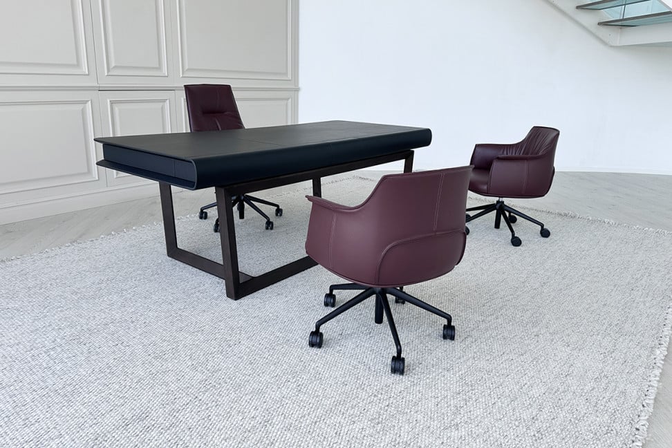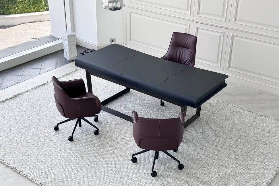 Nella scrivania Peek-a-Book Large di Poltrona Frau, concepita da Roberto Lazzeroni, risiede il contrasto tra la semplicità concettuale e i dettagli sofisticati. Realizzata a partire da un unico foglio in legno multistrato di pioppo, la struttura viene sapientemente curvata e rivestita in Pelle Frau®, materiale iconico per la sua morbidezza e resistenza. Il risultato è un oggetto che richiama, visivamente ed emotivamente, un prezioso libro rilegato in pelle. Due cassetti sono integrati in modo funzionale nella struttura.