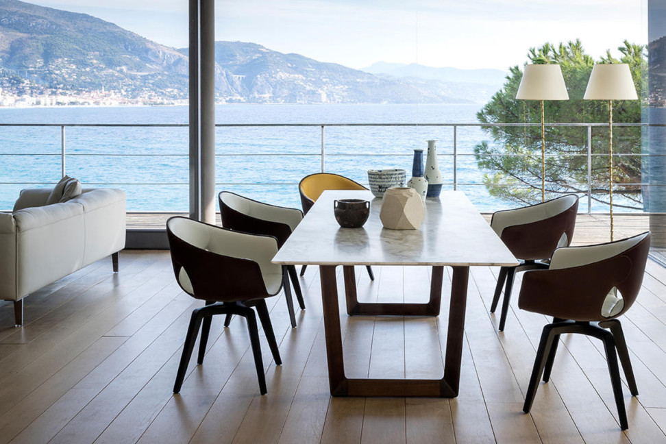 Il tavolo da pranzo Bolero si distingue per l’eleganza discreta delle sue linee e per il dialogo tra superfici e volumi. Il piano, disponibile in legno o marmo, è visivamente alleggerito dal sistema di distanziatori che lo separa dai sostegni, creando un effetto di sospensione che rende il tavolo adatto sia a spazi residenziali di rappresentanza sia a contesti contract di alto livello.