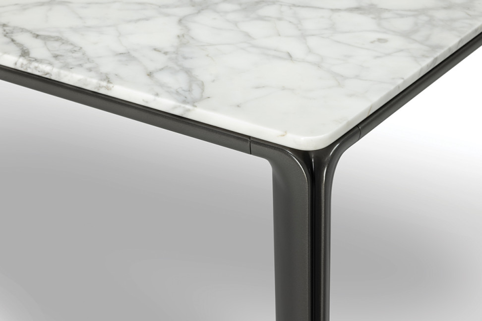 Tavolo di design il cui tratto distintivo sta nelle gambe: con un gioco plastico che ricorda l'alta sartoria, i due lembi della gamba si piegano e si uniscono senza toccarsi. Il tavolo da pranzo Homey è disponibile in versione rettangolare o quadrata, con il piano in legno o marmo.
