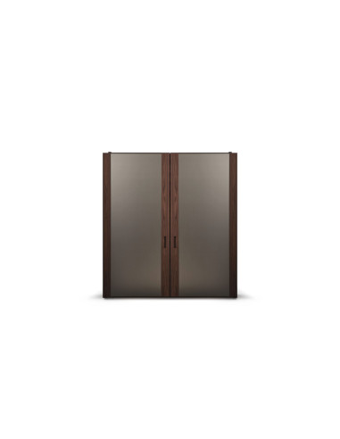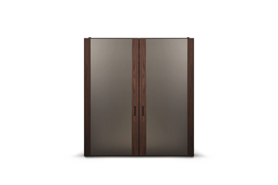 L’armadio Gladko può essere personalizzato scegliendo ante scorrevoli complanari in legno, rivestite in cuoietto o in versione specchio fumé o naturale. L’interno può essere accessoriato con ripiani e cassettiere in legno, barre appendiabiti in metallo finitura peltro o rivestite in cuoietto, elementi divisori per cassetti e illuminazione LED integrata.