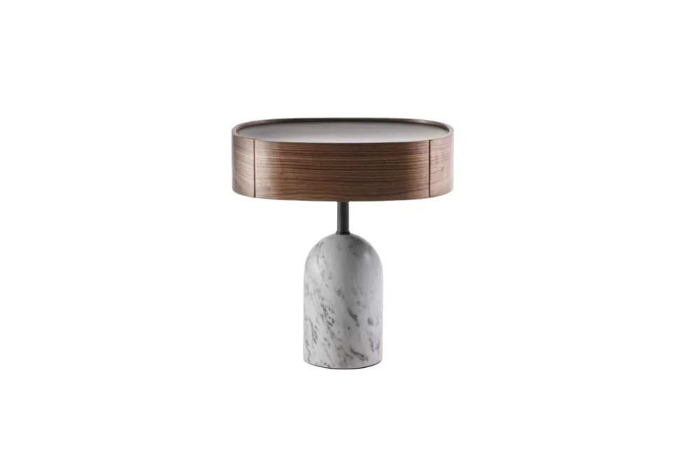 La base consta di un elegante stelo centrale in metallo in finitura grigio peltro conferisce al comodino una finitura sofisticata e moderna. Il comodino Ekero Night presenta una base cilindrica in marmo bianco Carrara o grigio Carnico, che conferisce stabilità e durabilità al prodotto. Disponibile esclusivamente nella seguente dimensione: larghezza cm.53, profondità cm. 41 e altezza cm.54.