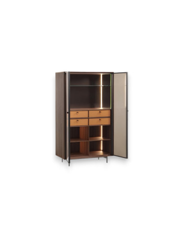 Il mobile bar Matics si distingue da tutti gli altri mobili soggiorno grazie alla sua versatilità e alla cura dei dettagli. I vani superiori presentano un rivestimento in metallo Bronzoro goffrato e fianchi specchiati, che ottimizzano la percezione dello spazio. I quattro cassetti, rivestiti in cuoietto sul fondo e sul frontale, offrono una pratica organizzazione con divisori porta posate e un vassoio estraibile. I vani inferiori, interamente in legno, completano la struttura con un tocco di calore e naturalezza, rendendo il Matics Bar un elemento indispensabile per chi cerca funzionalità e stile.