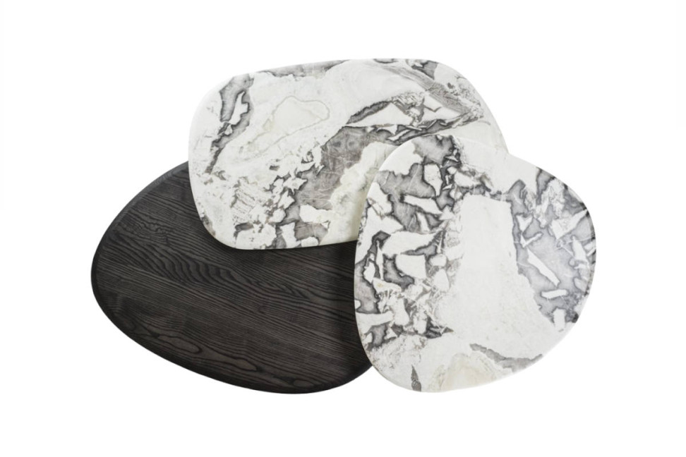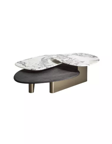 La base è realizzata in legno laccato opaco poro chiuso finitura Bronzoro, e conferisce al tavolino una solida presenza e un aspetto sofisticato. Il top, che si componeva esclusivamente di tre finiture in marmo, ora si arricchisce di una componente in legno e con tre diverse forme e dimensioni da combinare.