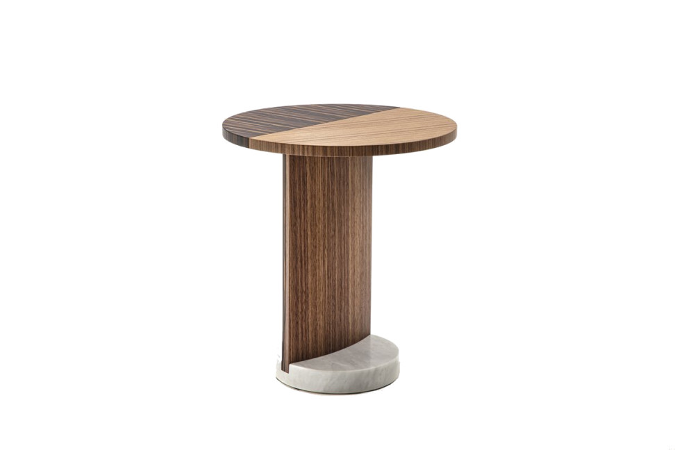 Il marmo Grigio Carnico della base lascia presto il posto al pregiato ebano Macassar che caratterizza la struttura. L'ebano, a sua volta, si fonde con il noce canaletta sul piano superiore. E proprio questo taglio netto sul top va a diventare il tratto distintivo dei tavolini Leaf di Porada, donandole un sapore decisamente ricercato.
