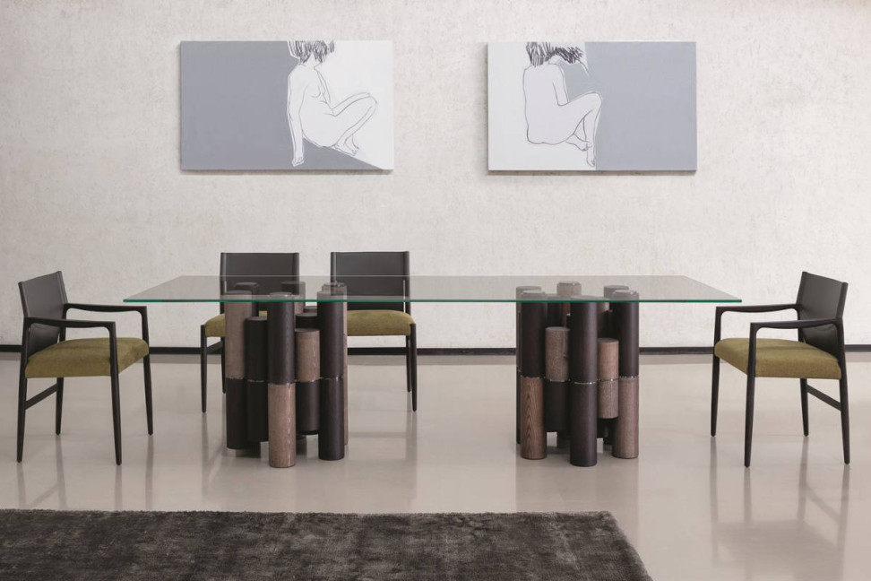 Il tavolo Pilar di Porada è composto da una base costituita da diversi elementi in legno massello di frassino e metallo cromo nero che sorreggono un piano in cristallo trasparente temperato da 15mm. Inoltre è possbile scegliere tra due differenti finiture di frassino e diversi modelli per il piano: tondo, ovale o rettangolare.