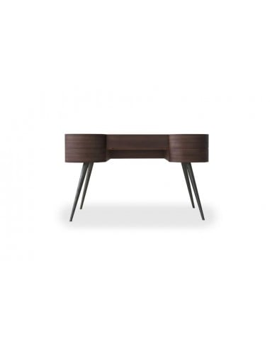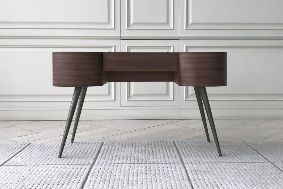 Micol di Porada presenta una struttura in noce canaletta con gambe in ottone bronzato spazzolato. Cinque comodi cassetti ed un inserto in cuoietto sul top rendono questa sfiziosa coiffeuse un elemento d’arredo non solo bello da guardare, ma anche utile e funzionale.