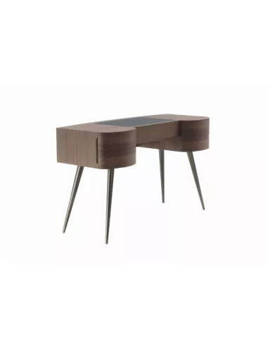Porada, che ha fatto della lavorazione del legno il suo punto di forza, realizza la toletta Micol in noce canaletto con gambe in ottone bronzato spazzolato, arricchendola con un delizioso inserto in cuoietto. Cinque comodi cassetti rendono questa sfiziosa coiffeuse un elemento d'arredo non solo bello da guardare, ma anche utile e funzionale, ideale per la donna che ama coccolarsi e prendersi cura di sé.