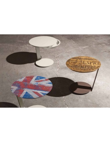 La struttura in metallo laccato opaco è realizzata in tanti colori diversi, mentre il piano superiore è realizzato, oltre che laccato opaco o lucido, con finitura effetto vintage, ottenuta applicando particolari stampe rifinite a mano sulla superficie del tavolo.