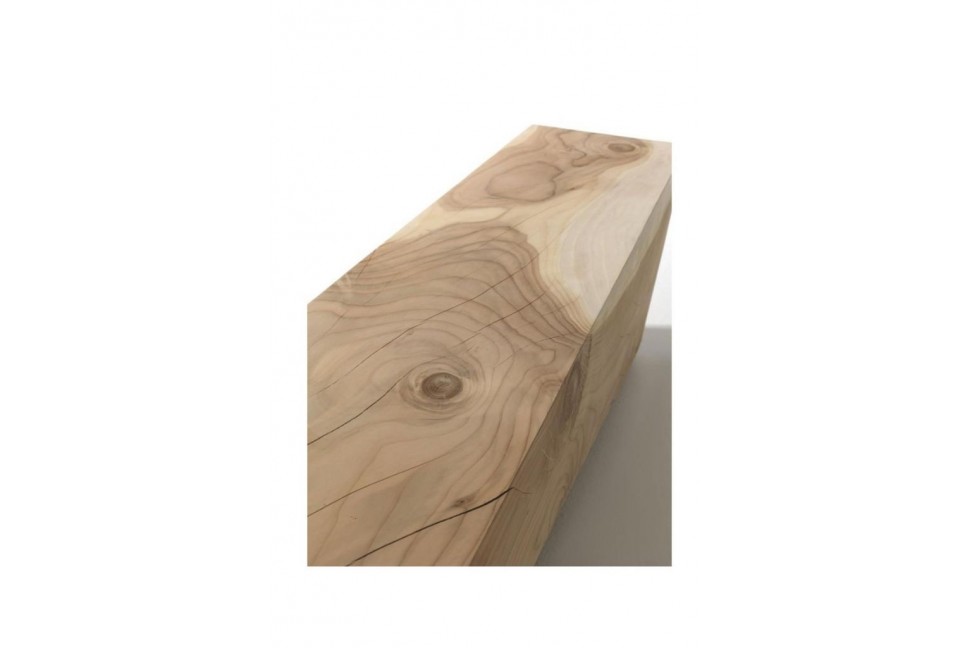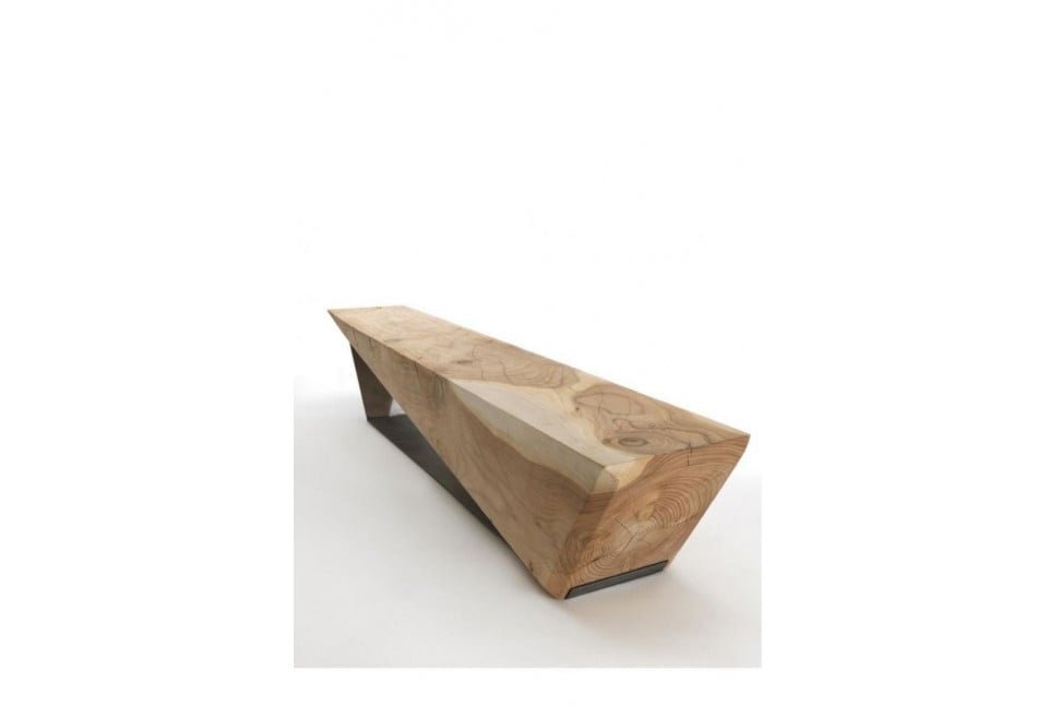 La panca Wedge è costituita da due elementi triangolari posti in maniera speculare l'uno sopra all'altro e presenta una base in metallo, disponibile in varie finiture, e una seduta ricavata da un unico blocco di legno massello, lavorato a mano senza l'aggiunta di alcun tipo di trattamento.