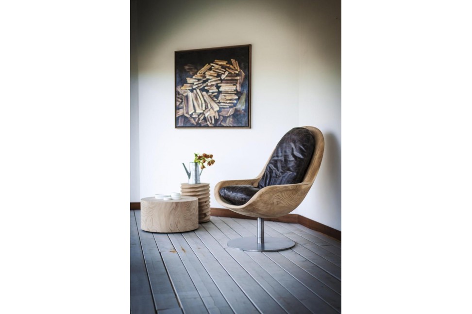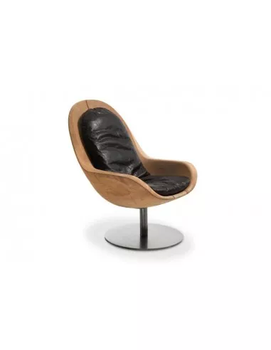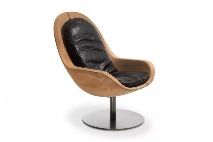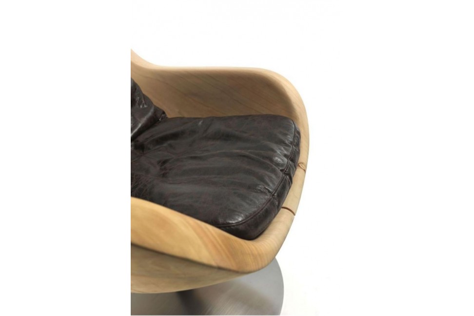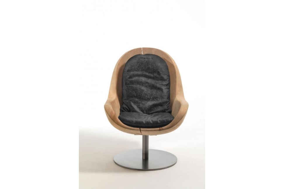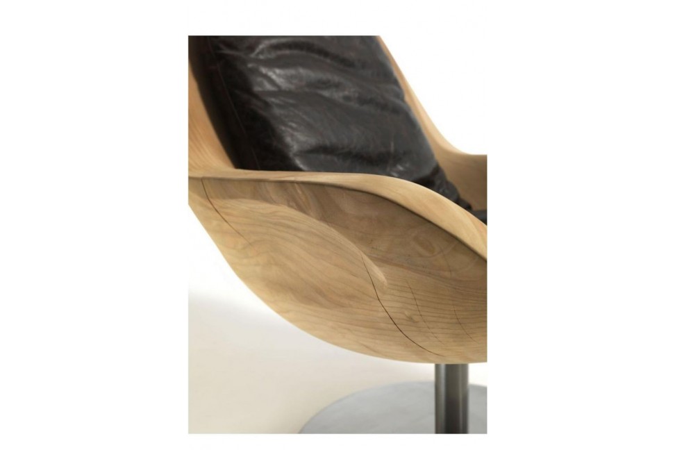 Questo particolare complemento d'arredo è stato progettato dal team di designer del gruppo Pininfarina e si distingue per la peculiare forma a guscio della seduta, ricavata da un blocco unico di legno lavorato a mano senza l'aggiunta di trattamenti. La base girevole in metallo funge da supporto e da piedistallo, mettendo ancor più in risalto la seduta.