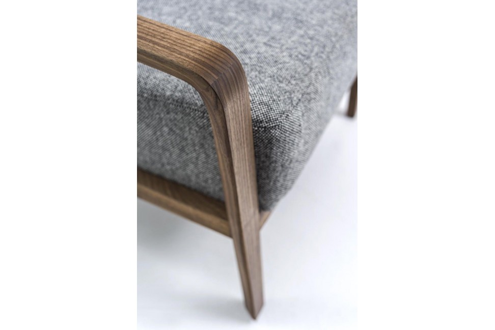 Disponibile sia con rivestimento in tessuto che in pelle, Noblè presenta delle cuciture a vista che ne delineano la figura, mentre la struttura in legno incornicia lo schienale e la seduta mettendoli ancor più in risalto.