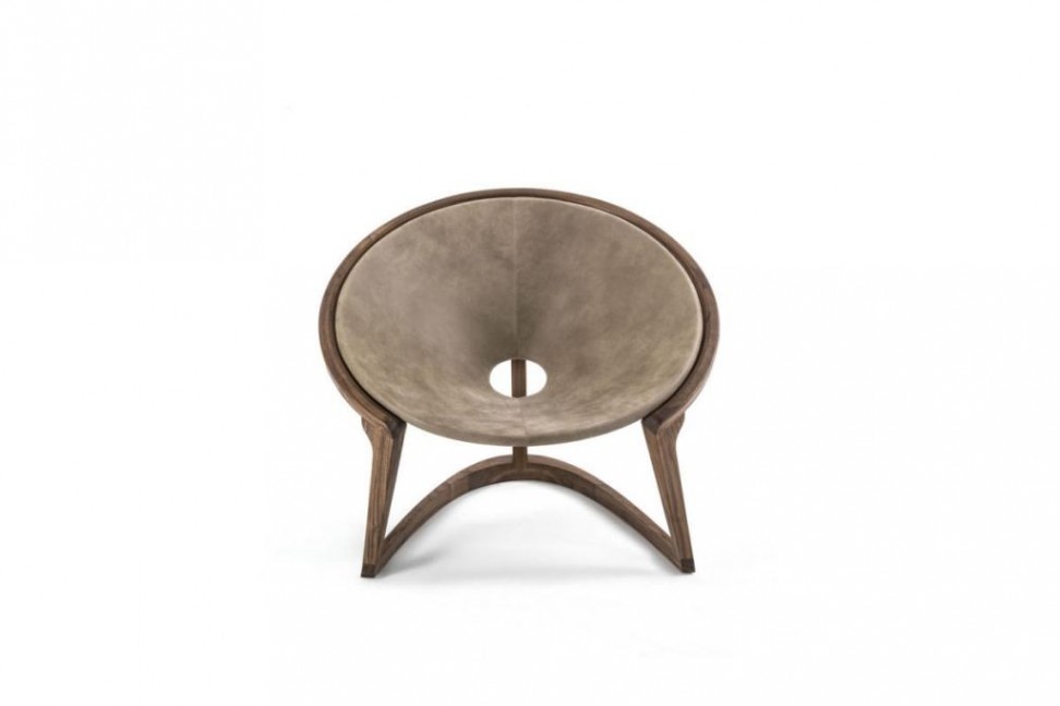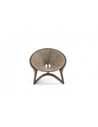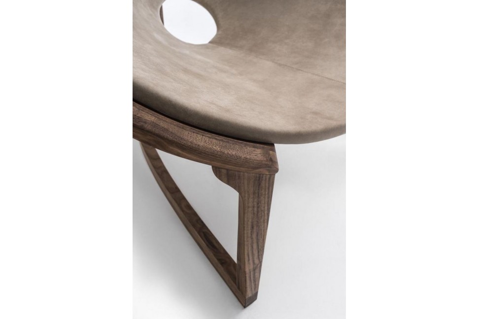 La sedia Yin&Yang è infatti composta da una solida struttura in legno massello interamente tornita, assemblata e levigata a mano, la cui staticità viene controbilanciata dalla fluidità del cono aperto che forma la seduta e lo schienale. L'interno è rivestito in morbido camoscio con cuciture a vista, che armonizzano la rigidità del legno.