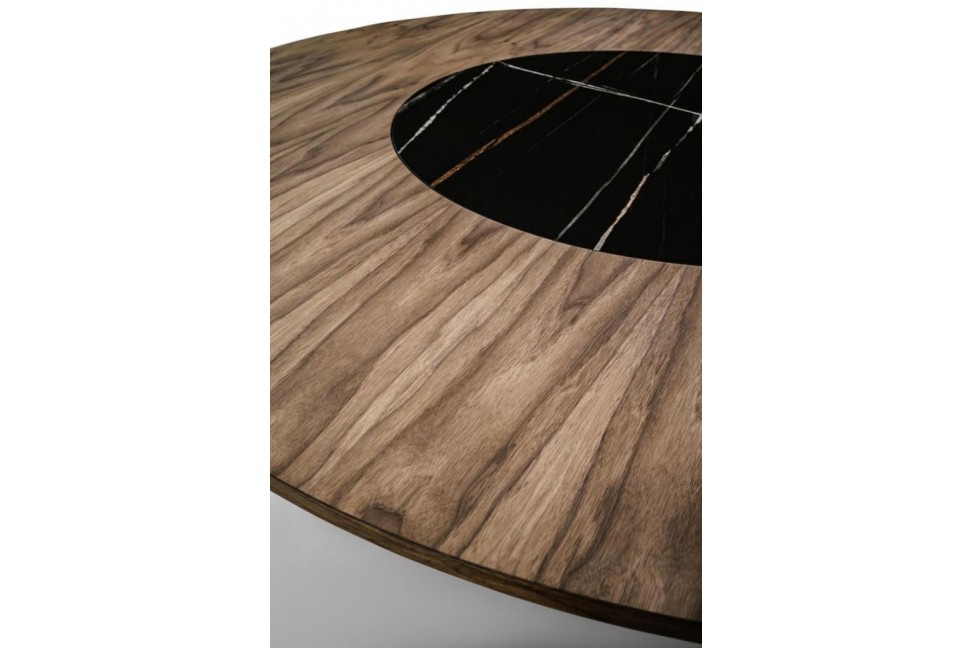 Il tavolo Shang presenta un basamento composto da listelli di legno massello di noce o rovere, la cui forma simboleggia l'infinito, mentre la parte superiore è in legno listellare con inserto in marmo Emperador lucido.