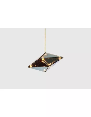Questa lampada a sospensione cattura l'attenzione con la sua originale struttura tridimensionale in ottone e acciaio, formata da due prismi dalle superficie sfaccettata e uniti dalla stessa base. Quando accesa, le luci interne, danno vita ad un gioco infinito di riflessi che rendono l'intera struttura viva e dinamica, mentre quando è spenta l'ambiente intorno viene riflesso sulla superficie di ogni singola sfaccettatura animando la lampada con mille colori. Maxhedron, disponibile in varie dimensioni, in versione verticale o orizzontale, è realizzata in varie finiture, acciaio nero, bronzo lucido, nickel lucido e bronzo spazzolato, lasciando ampia scelta.
