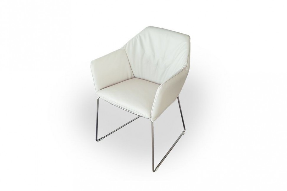 Sedia con braccioli rivestita in pelle color grigio chiaro e base in metallo cromato lucido.