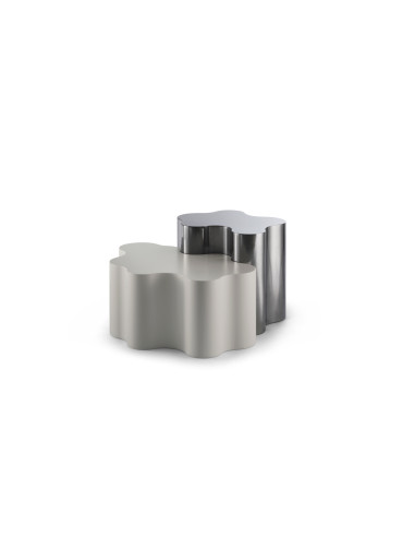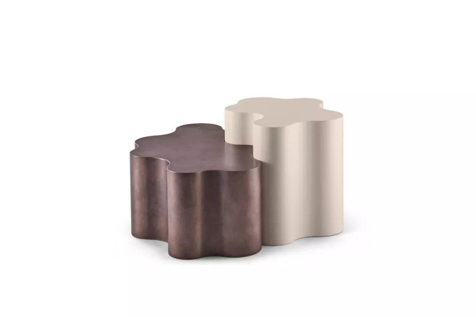 Piano e struttura: Il tavolino è in poliuretano rigido laccato opaco, con verniciatura artigianale a effetto spazzolato oppure con verniciatura effetto metallizzato. Sono disponibili cinque colorazioni di finitura: coral brown, grigio quarzo, bianco, grigio seta o nude.