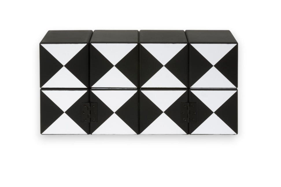 L’opera cinetica OTI 3 - Quattro più Quattro Uguale a....Uno, realizzata dall'artista ternano Sandro Tomassini, è composta da otto cubi, ognuno di misura cm.12x12x12, realizzati in legno verniciato con colori acrilici. Questi cubi sono collegati tra loro con delle cerniere, e muovendoli danno origine a varie forme compositive, tra le quali quella di un cubo da cm.24x24x24. Da qui deriva il titolo ironico dell’opera. Il colore di ogni cubo è nero per quattro delle sei facce, mentre le altre due sono un insieme di triangoli e rombi in bianco e nero. Anche questa è un’opera particolarmente ludica, che invita al gioco e alla sperimentazione.