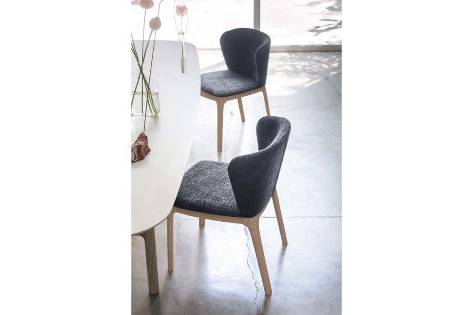 La sedia Vanity ha la particolare lavorazione della base e delle gambe fatta in modo tale da far risaltare tutte le connessioni che legano le loro varie componenti.La sedia Vanity è caratterizzata da una struttura in legno e da seduta e schienale rivestiti in tessuto.