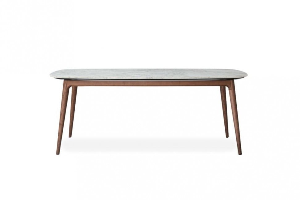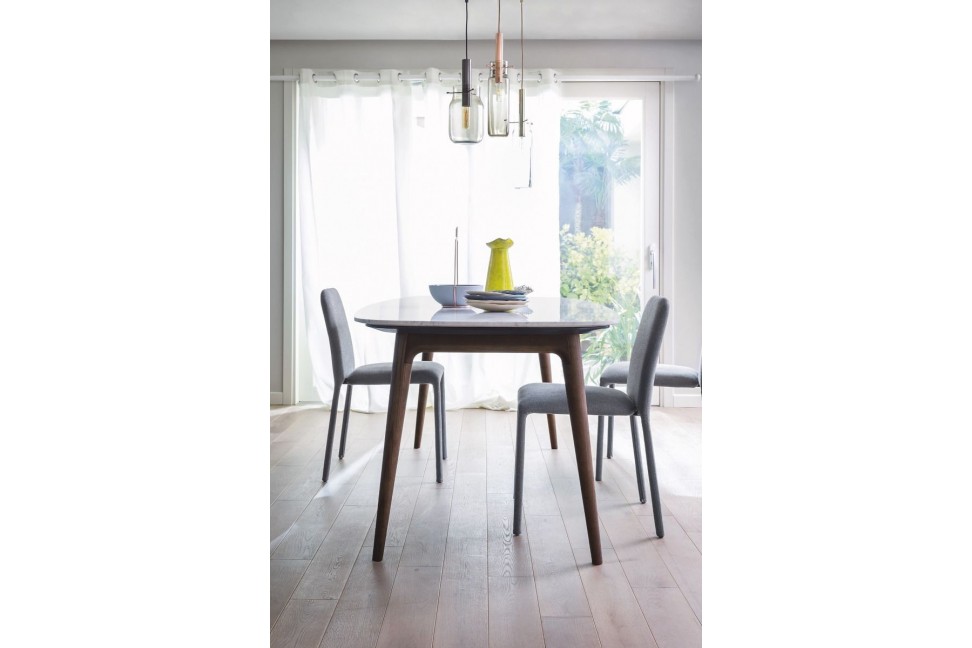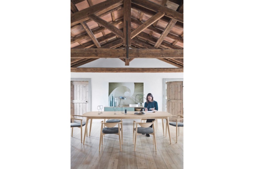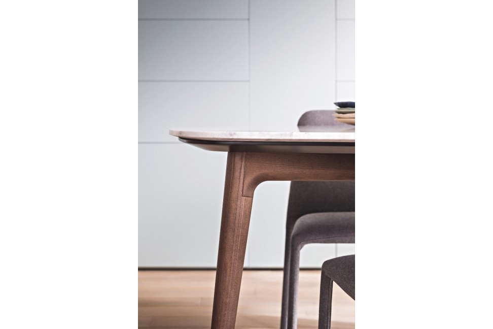 Il tavolo Amami ha delle linee armoniche e fluide, oltre che eleganti dettagli.Il tavolo Amami, disponibile in due misure, è caratterizzato da gambe, inclinate verso il pavimento per dare maggior senso di leggerezza, in legno rovere chiaro o noce canaletto mentre il piano può essere in marmo o nello stesso legno della base o anche in tutti i colori laccati opachi.